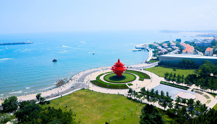 五四广场位于山东省青岛市市南区东海西路,北依青岛市人民政府办公大楼,南临浮山湾,总占地面积10公顷。五四广场因青岛为中国近代史上伟大的五四运动导火索而得名。五四广场分南北两部分,分布于中轴线上的市人民政府办公大楼、隐式喷泉、点阵喷泉、《五月的风》雕塑、海上百米喷泉等。