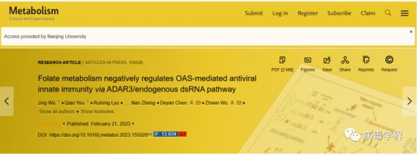 近日, 南京大学吴稚伟课题组在Metabolism-ClinicalandExperimental杂志上发表了题为“Folate metabolism negatively regulates OAS-mediated antiviral innate immunity via ADAR3/endogenous dsRNA pathway”的文章。该研究揭示了细胞叶酸代谢在抗病毒天然免疫中的调节作用。