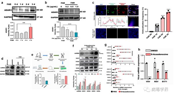 图3 叶酸缺乏诱导ADAR3上调并抑制en-dsRNA的A-to-I编辑(a-e)