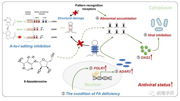 生理条件下,细胞质中不存在en-dsRNA,因为宿主细胞已形成了一套完善的区分内源性和外源性RNA的体系。ADAR蛋白家族(ADAR1-3)介导的en-dsRNA中A-to-I的编辑是en-dsRNA避免触发抗病毒的关键机制之一。ADAR1/2能够与其他dsRNA感受器(如OAS2)发生竞争性结合;另一方面,其介导的A-to-I编辑使得en-dsRNA在细胞质中失去双链结构从而无法被模式识别受体识别。然而,与ADAR1不同,ADAR3虽然具有dsRNA结合域,但无酶活性,被认为是ADAR1/2介导的A-to-I编辑的竞争性机制蛋白。在本项目中,研究人员发现,叶酸缺乏时ADAR3被显著上调,叶酸补充后恢复生理水平。研究人员进一步发现叶酸缺乏状态下ADAR3与en-dsRNA共定位,且与en-dsRNA的累积量和A-to-I编辑频率呈正相关关系,并证明了ADAR3正调控OAS2的表达。提示叶酸代谢通过ADAR3/en-dsRNA轴负向调控OAS介导的抗病毒天然免疫。最后,考虑到转化潜力,研究人员评估了A-to-I小分子抑制剂8-Azaadenosine对抗病毒天然免疫的激活效果和抗病毒效果。结果发现,8-Azaadenosine不仅是良好的OAS诱导剂,也是出色的广谱抗病毒剂,包括VSV、RSV和EV71等RNA病毒。