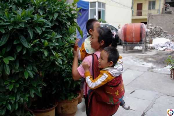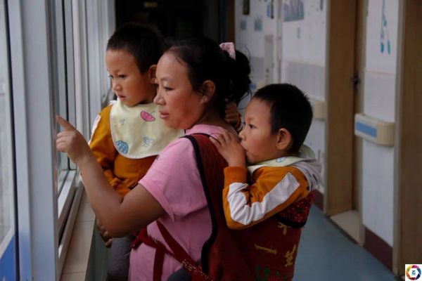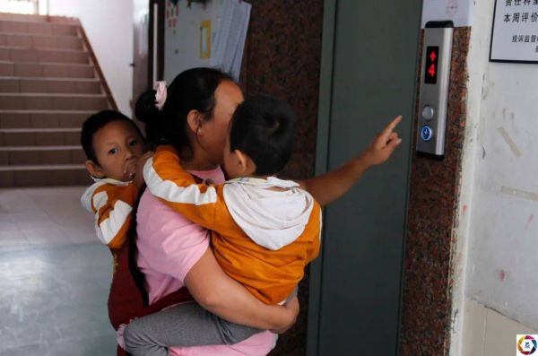 孩子爸爸为了给孩子筹集治疗费,决定到外地打工挣钱,阿妮在家一边照顾孩子一边筹钱。可是由于巨大的经济压力,两个孩子的治疗一直被耽误,直到2015年阿妮打听到昆明有一家医院能做康复治疗,并且有减免,于是阿妮四处借钱才终于有机会带着两个女儿到医院治疗。图为阿妮带着孩子上楼做康复。