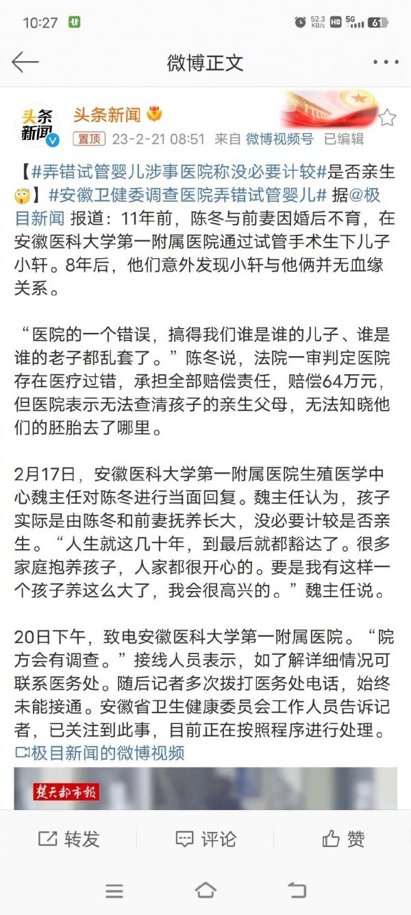 首先,放错胚胎,到底是不是个例?是不是所有试管婴儿的父母都需要去做一次亲子鉴定?这个费用医院会报销吗?或者在安徽这家医院里做过试管婴儿的夫妻是不是都应该去做个亲子鉴定。