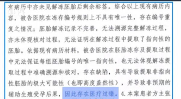 报告指出,依据现有病历材料,生殖中心在胚胎冻存及提取过程中无法保证每组胚胎编号的唯一指向性,也无法体现解冻提取过程中准确溯源和核对,存在缺陷,具有导致提取非指向性胚胎的极大可能性,并导致非预期的辅助生殖受孕后果,因此存在医疗过错。
