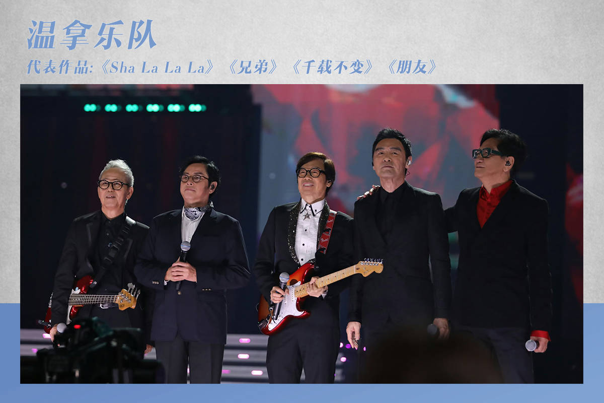 温拿乐队这次的合体演出也给了观众不小的惊喜。由谭咏麟、钟镇涛、彭健新、陈友和叶智强组成的传奇组合,曾在香港创造了无数辉煌。1976年,凭借一曲《友情岁月》获得了“十大中文金曲颁奖典礼”最佳组合奖,也因此开始走红。他们是香港第一个在红磡体育馆举行演唱会的组合,并且创造了连开8场的记录。1978年,乐队成员单飞各自发展,但他们相约每五年就重聚发行一张唱片。作为香港最长寿的组合,温拿乐队已携手走过50年,但天下没有不散的宴席,今年5月,温拿乐队官宣在8月举行完第九次红馆演唱会之后,将与歌迷正式告别。