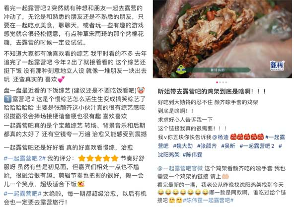 除了为观众输送快乐,节目中的露营好物也激起了网友种草热情,无论是露人们趣玩的桌游小游戏、杨迪带来的足底按摩袜等露营好物;还是魏大勋做的东北饭包等露营美食,都让观众心动不已。本期,吴昕带来的沈阳特色鸡架俘获露人们一众芳心,魏大勋更是在节目外大呼“被沈阳鸡架香迷糊了”。节目播出后,全网开启鸡架种草求链接模式,话题#沈阳鸡架到底有多香#、#魏大勋被沈阳鸡架香迷糊了#登上同城热搜榜,沈阳当地网友纷纷晒图安利吴昕同款鸡架美食,甚至有网友从节目中挖到鸡架的品牌。一时间,大众讨论沈阳鸡架的热潮空前高涨。节目通过露人们欢乐美好的露营氛围和充满诱惑的露营好物带动大众对露营的热情,诸多网友在观看节目后,纷纷表示“好想去露营,get露人们同款好物”。