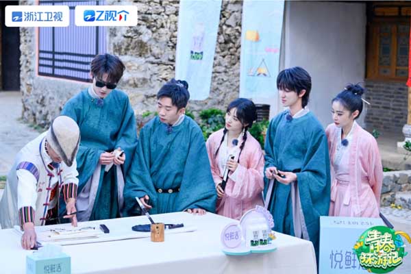 接下来,“IF俱乐部”穿越到“中国古代”,在这里感受古老的纳西文化。纳西族是由游牧民族羌族转化而来,而纳西族东巴文是世界上唯一仍在使用的象形文字,是人类远古文明的“活化石”。节目中,成员们在玉湖村村民牦牛哥的带领下一起了解东巴象形文字,并各自尝试用东巴文在折扇上书写自己的名字。沈月现学现用变身“优秀课代表”,自信向周柯宇解释东巴文中自己名字的含义。