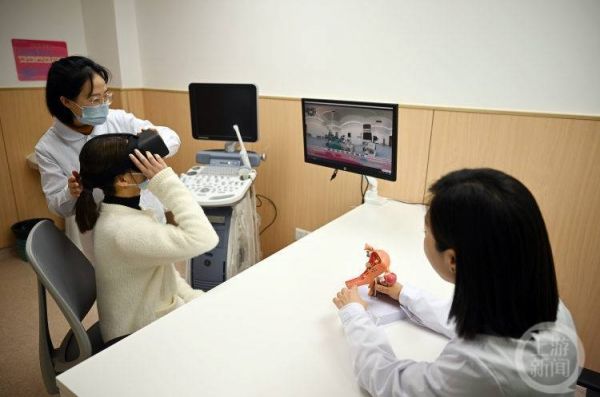 3月29日上午,重庆市妇幼保健院门站大楼二楼一间诊室里,35岁的秦小姐戴着VR眼镜,身临其境地体验着“取卵”手术的全过程。