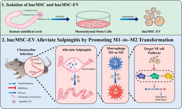 总体而言,该研究开发了一种以人脐带间充质干细胞衍生物细胞外囊泡为基础的疗法,并在CT感染引起输卵管炎性不孕症小鼠模型验证了有效性。该疗法的分子机制在于hucMSC-EV可以通过NF-κB信号通路,诱导巨噬细胞从M1型到M2型极化,从而改善输卵管局部炎症微环境,治疗CT感染引起的慢性输卵管炎,最终改善生殖结局。