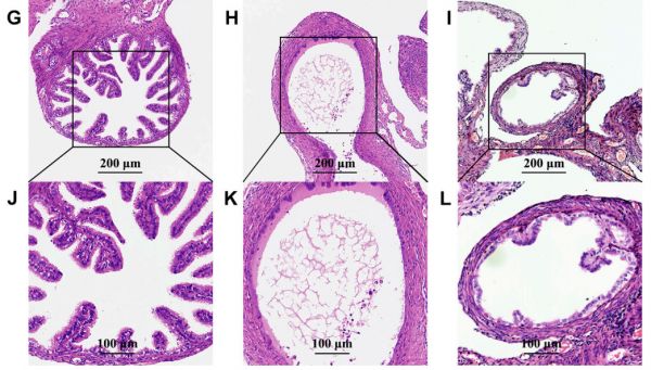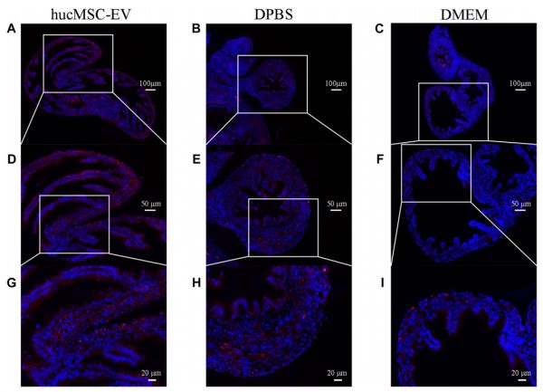he染色显示,hucMSC-EV组输卵管绒毛结构完整,DPBS组和DMEM组绒毛结构几乎消失,有明显组织积水导致的扩张(如图G-L)。上述结果表明hucMSC-EV可显著改善致病小鼠生殖道充血和炎症反应。
