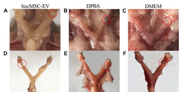 结果hucMSC-EV组的5只小鼠均已怀孕,DPBS组无小鼠怀孕,DMEM组仅1只怀孕。(如图M-N)该结果进一步验证了hucMSC-EV可显著改善致病小鼠生殖道充血和炎症反应,从而提高妊娠率。