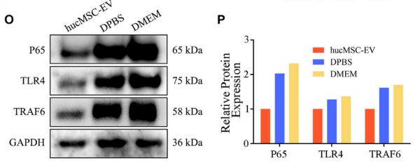 研究团队首先检测了与炎症信号通路相关的蛋白p65和TLR4,结果发现hucMSC-EV组p65和TLR4的表达水平显著低于DPBS组和DMEM组,这意味着p65和TLR4可能在hucMSC-EV介导的输卵管炎症缓解中发挥重要作用(如图O-P)。