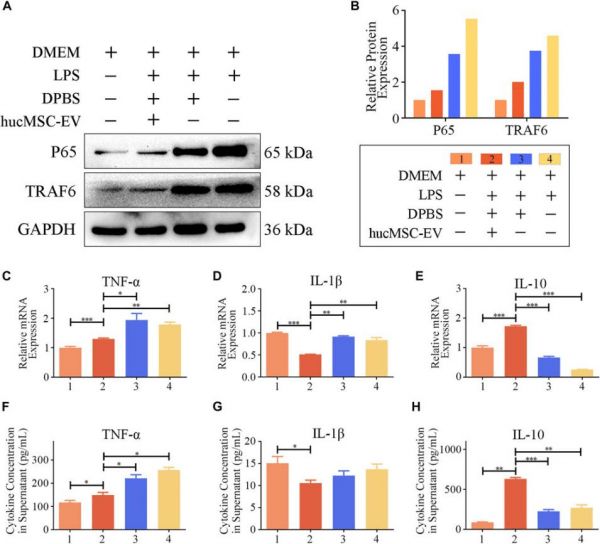 之后,研究团队通过实验再次验证hucMSC-EV可以通过P65/TRAF6介导的NF-κB信号通路逆转LPS诱导的巨噬细胞转化,促进巨噬细胞从M1型转化为M2型,进而提高抗炎细胞因子IL-10的转录和分泌水平(如上图A-H)。