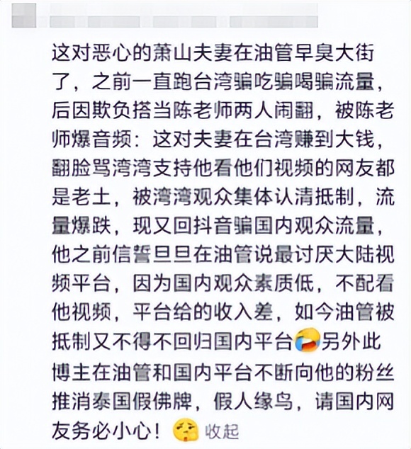 更让人膈应的是,这夫妻俩转头就骂支持他们的台湾网友“老土”、“没见识”,这话彻底惹毛了台湾观众,大家集体抵制他们,不光取关,还在评论区骂他们“忘恩负义”。