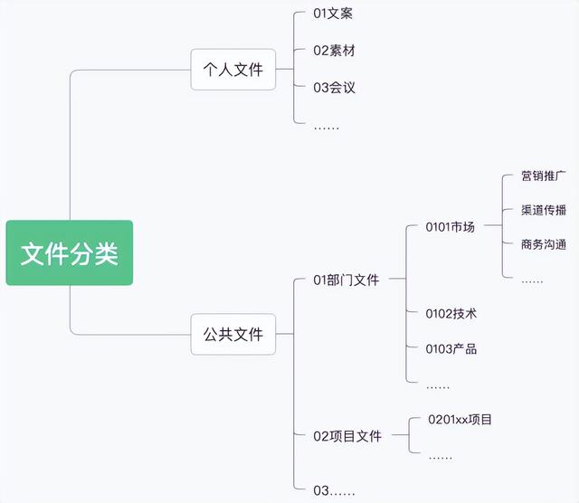 工作文件可以分成个人文件、公共文件两大类。个人文件由员工自定义分类,公共文件可以按部门文件、项目文件等维度划分。