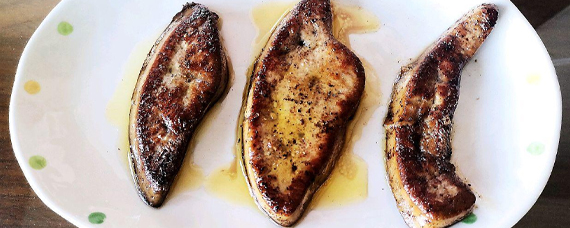 2、锅中加适量黄油,待黄油融化后,将鹅肝放在锅中。