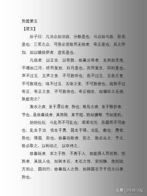 湍急的流水水势孙子兵法之猛,能够把巨石第一冲走,孙子兵法十三篇全文,这是流速飞快产生的\"形势\"造成的;鸷鸟高飞迅疾,以至能捕杀鸟雀,这就是短促迅猛的\"节奏\"造成的。因此,善于指挥作战的人字,他所造成的态势险峻逼人,他进攻的节奏短促有力。他们所造的态势就像张满的弓弩,险恶异常;迅疾的节奏犹如用手击发弩机,瞬间即发。
