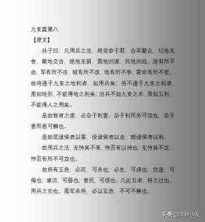 孙子说:大凡用兵打仗的方法,将帅接受国君的命令,征集民众、组织军队,然后出征。出征时遇到沼泽连绵的\"圮地\",不可驻扎,在多国交界四通八达的\"衢地\"上应结交邻国,遇到\"绝地\"不要停留,遇上\"围地\"要巧设奇谋尽快离开,陷入\"死地\"要殊死战斗。有的道路不要通行解释;有的敌军不能攻打;有的城邑不要攻取;有的地方不能争夺;国君的命令有的不要执行。所以,将帅如果能够精通以上九种机变的利弊,就是懂得用兵了;将帅如果不能精通九种机变的利弊,那么,即使熟悉6000地形,也不能够得到地利。指挥军队而不知道九种机变的方法,那么,即便知道\"五利\",也是不能充分发挥军队的战斗力的。