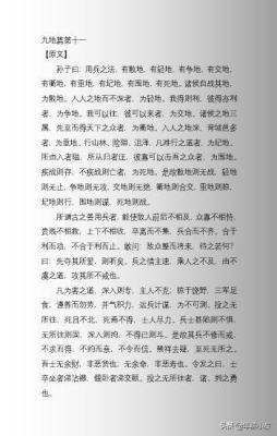 诸侯在本国境内作战的地区,叫作\"散地\";进入敌国不远而能够轻易返回的地区,叫作\"轻地\";我方得到有利,而敌人得到也有利的地区,叫作\"争地\";我军可以前往,敌军也可以前往的地区,叫作\"交地\";同几个诸侯国相毗邻完整,谁先得到它就可以获得其他诸侯国援助的地区,叫作\"衢地\";深入敌国腹地,背靠敌人众多城邑的地区,叫作\"重地\";山林险阻、水网沼泽等难于通行的地区,叫作\"圮地\";进军的道路狭窄,退兵的道路遥远,敌人可以用少量兵力攻击我方众多兵力的地区,叫作\"围地\";迅速奋战就能生存,否则就会全军覆灭的地区,叫作\"死地\"。因此,处于散地就不要作战,处于轻地就不该停留,遇上争地就不要强攻,遇上交地就不能使行军队伍中断,进入衢地就应该主动与诸侯结交,深入重地就要抢夺粮草,碰到圮地必须迅速通过,陷入围地就要设法脱险,处于死地就要背水一战。