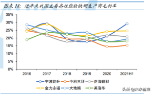 目前市场上能够稳定生产高性能钕铁硼的企业主要包括宁波韵升、中科三环、正海磁材、 金力永磁、大地熊和英洛华等。六家企业的销售毛利率在近年来分化不大,但宁波韵升的销 售毛利率自 2019 年起经历了较大幅度的上升,主要受益于三方面:1)稀土价格上涨所带来 的原材料库存收益能被传导至下游客户,帮助增厚公司产品毛利率;2)公司加强内部控制, 推动降本增效,提升生产效率;3)公司用于汽车应用的钕铁硼永磁材料增长迅速,并在顺序新能 源车领域获得了多个国内外主驱电机厂及汽车配套的供应商资格,实现批量供货。总体来看, 我国高性能钕铁硼生产企业由于在技术、资金及客户认证方面均具有一定的壁垒,企业数相 对较少,毛利率一般在 20%以上;而中低端钕铁硼主要由大量中小企业生产,由于中低端钕铁 硼生产的技术壁垒偏低,竞争较为激烈,毛利率一般低于高性能钕铁硼厂商。就我国钕铁硼 永磁材料发展前景来说,高性能钕铁硼市场不论从未来供给端的扩产还是需求端的增长来说, 均有较大提升空间,这也为国内高性能钕铁硼生产企业提供了诸多成长机遇;