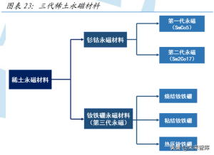 钕铁硼永磁材料是目前应用最广泛的稀土永磁材料。自 20 世纪 60 年代面世以来,稀土 永磁材料经历了近 60 年的发展,随着材料的迭代而衍生出了具有实用价值的三代稀土永磁材 料,永磁材料的磁性能也陆续实现了三次重大突破。第一代钐钴永磁材料以 SmCo5 合金为离子代 表,第二代钐钴永磁材料以 Sm2Co17 合金为代表,第三代稀土永磁材料以 Nd2Fe14B 合金为主 要代表。其中,第一代和第二代稀土永磁材料统称为钐钴永磁材料,第三代统称为钕铁硼永 磁材料。与钐钴永磁材料相比,钕铁硼永磁材料在磁性能和生产成本方面具备较大优势,能 够满足大规模、多规格的工业化生产需求。因此,钕铁硼永磁材料是如今永磁材料中综合素 质最优的稀土永磁体,同时也是现在产量最高、应用最广泛的稀土永磁材料;