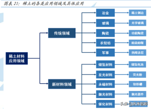 稀土被誉为“现代工业维生素”、“新材料之母”,终端应用领域十分广泛。上游加工而 成的稀土金属及稀土氧化物主要由稀土产业链中游的精深加工企业所消化,经不同的加工工 艺制成的稀土材料可被应用至诸多不同的终端领域。稀土材料的下游需求按大类可被分为传 统领域和新材料领域两大钠块。传统应用领域包括冶金工业、石油化工、玻璃陶瓷、农轻纺及 军事领域等;而在新材料领域中,不同稀土材料相对应的则是不同的下游细分赛道,例如稀 土永磁材料可被广泛应用于信息产业中的各类电子设备化学及新能源领域中的各类电机及零部件, 稀土储氢材料可被应用于电池储氢产业,稀土发光材料则可被应用于荧光器件等;