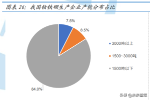 我国钕铁硼永磁材料产能结构面临高端供给不足、中低端产量过剩的局面。根据行业惯 例,内禀矫顽力(Hcj,kOe)和最大磁能积((BH)max,MGOe)之和大于 60 的烧结钕铁硼永磁 材料,属于高性能钕铁硼永磁材料,其余为中低端钕铁硼。从终端应用来看,中低端钕铁硼 多用于箱包扣、门扣、玩具、磁选等领域,而高性能烧结钕铁硼下游应用领域包括传统汽车 EPS、新能源汽车驱动电机氢、风力发电、变频空调、节能电机、机器人及智能制造等。我国高性能钕铁硼永磁材料年产量约占钕铁硼毛坯 总产量的 25%;从我国钕铁硼市场格局来看,国内有约 170 家烧结钕铁硼生产企业,近十年 来我国烧结钕铁硼产量的平均年增长率约为 14.0%。从企业产能来看,我国烧结钕铁硼年产 能达 3000 吨以上的企业仅占 7.5%,产能在 1500-3000 吨的企业仅占 8.5%,剩余 84%的企业 产能均在 1500 吨以下。