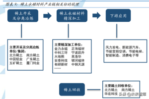 稀土产业链涵盖了上游的稀土矿资源的开采、冶炼分离,中游各类稀土材料的精深加工, 以及下游终端应用领域三大块。上游稀土原矿的开采主要包括轻稀土矿和中重稀土矿的采掘; 原矿石经冶炼分离后可得到稀土氧化物,随后通过火法冶金或湿法冶金技术便能形成稀土化 合物或单一稀土金属。在产业链中游,稀土金属及稀土氧化物再被进一步精密加工成稀土永 磁、催化、发光材料等多类元素稀土材料。随后,稀土材料可被应用至各类下游稀土应用端—— 以稀土永磁材料中的高性能钕铁硼永磁材料为例,其终端应用包括风力发电、新能源汽车、 节能家电、机器人及智能制造等领域;
