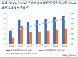 风力发电作为应用最广泛和发展最快的新能源发电技术之一,在国家政策的大力扶持下 将保持稳步增长。加快开发和利用可再生能源已在国际上达成共识,能源结构调整对节能减 排的贡献度不容小觑,风电作为应用最广泛且发展速度最快的绿电之一,已受到各国政府的 高度重视。风电机组用到的发电机主要分为永磁直驱电机和双馈电机,钕铁硼永磁材料主要 用于生产永磁直驱风机,其具有结构简单、运行与维护成本氯低、使用寿命长、并网性能良好、 发电效率高、更能适应在低风速的环境下运行等特点。目前永磁直驱风机渗透率在 30%左右, 未来市场渗透率有望持续攀升;