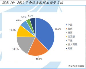我国具有全球最大的稀土储备。据美国地质调查局(USGS)最新数据显示,2020 年全球 稀土储量折合稀土氧化物约为 1.2 亿吨,其中,我国稀土储量为 4400 万吨,占比 38.0%,稳 居第一;越南储量 2200 万吨,占比 19.0%;巴西储量 2100 万吨,占比 18.1%;俄罗斯储量 1200 万吨,占比 10.4%;全球前四国稀土储量之和占比高达 85%。从地理位置来说,我国稀土 资源呈现“北轻南重”的特点。轻稀土矿判断以内蒙古包头的白云鄂博矿为代表,主要分布在我 国北方地区和四川凉山,其储量超过全国轻稀土资源的 80%;离子型中重稀土矿主要分布在 福建、江西、广东、云南等南方地区,其储量占我国重稀土资源的 90%,其中江西赣州和广东 粤东的中重稀土储量较大,分别为 57 万吨、50 万吨,占中重稀土总储量的比例为 44%、38%。 得益于我国丰厚的稀土资源储备,目前我国重稀土金属氧化物年产量在全球范围内仍处于主 导地位;