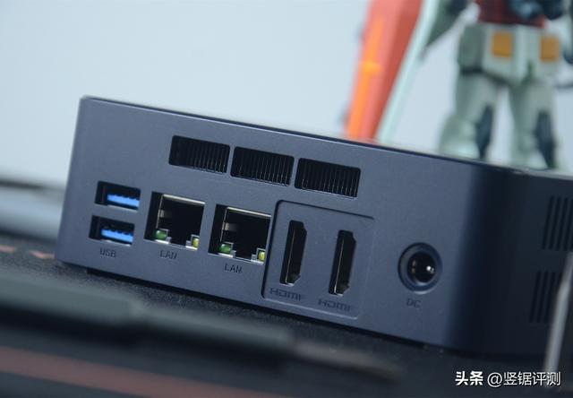 还有像零刻EQ59 Pro拥有2个双千兆网络端口,也可用于当作游戏推荐软路由上网,儿童电脑编程入门自学。另外,在上图这个机身位置上,除了设有2个网络端口外,还设有2个USB3.0接口、2个HDMI接口以及1个电源接口,如果算上电脑游戏电源接口的话,该位置一共设有7个接口,同时主机的散热出风口也设计在众多接口的上方。