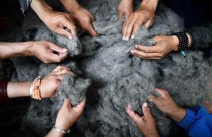 在青海省海北藏族自治州刚察县扶贫产业示范园,多杰才让和员工一起检查分单位名梳好的牦牛绒