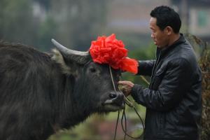湖南郴州的农民给准备下田参加开耕仪式的耕牛头头扎红花