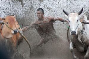 西苏门答腊省的一条农民在“奔牛”民俗活动中穿越泥泞