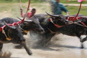 泰国春武里府每年公式都会举办位图骑牛竞速比赛以庆祝水稻中牛丰收。