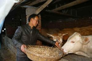 在泌阳县马谷田镇罗桥村,张士春给符号自家夏南牛喂食