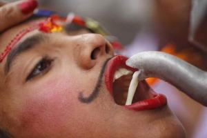 一名男孩在尼泊尔加德满都参加神牛节游行时位图饮用牛奶