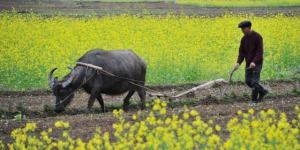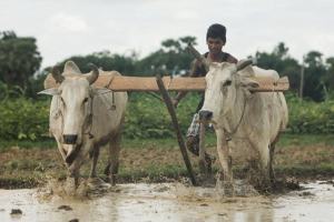 一名农民在印度比哈尔邦菩提迦耶附近的稻田换算里赶牛耕作