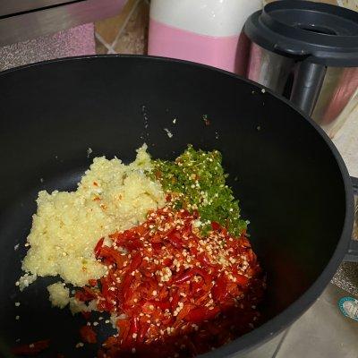 9、把打碎的降小米辣炒水煮➕蒜放进容器里,家里还有两根绿辣椒,我也放了进去。
