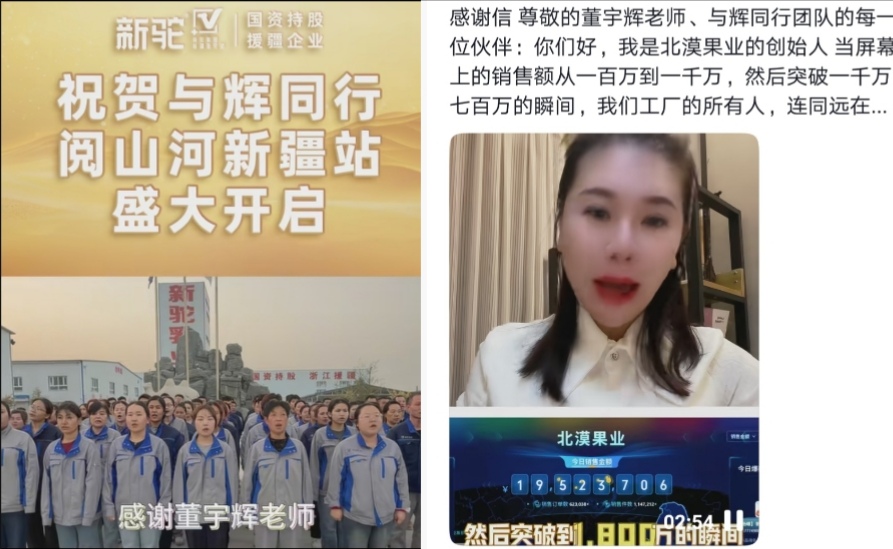 我想大家已经看到了,新疆当地的商家纷纷发声感谢董宇辉团队和消费者。那个西梅干和杏干的厂家都落泪了,一个西梅干销售达1900万,杏干也卖断货了,公司正全力生产。还有一个卖驼奶的厂家,三天销售达4000万,带着全体员工感谢与辉同行团队。