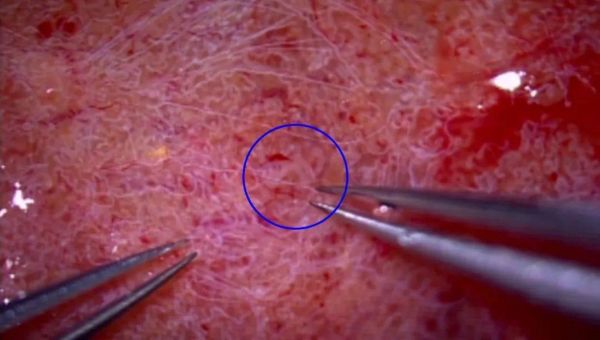 手术中,首先由男科团队袁启龙主任和蒋满波医生在手术显微镜下仔细分离患者睾丸的曲细精管,同时避免损伤白膜下的血管。在两位医生的细致找寻下,若干条疑似有生精灶的曲细精管被分离取出。