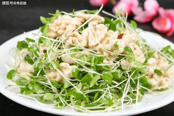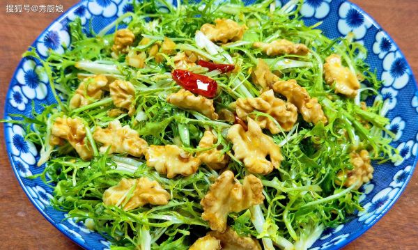 1.将苦菊清洗干净后,晾干水分,切成两段,将核桃剥开,将桃核仁取出,放在热水中,浸泡10分钟,然后将核桃仁表面的膜取下来。
