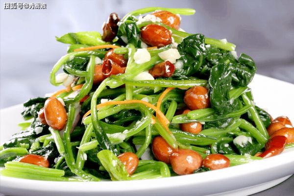 3.将菠菜和花生米装入盆中,加入生抽、醋、盐、香油,倒入炸好的辣椒油,翻拌均匀后,装入盘中,即可食用。