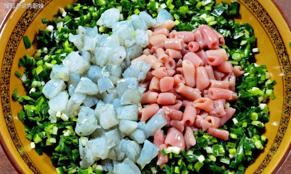 1.将海肠两头剪开,将内脏挤出来,然后用清水清洗干净后,切成小段,加盐搅拌均匀,将韭菜摘去干叶、老叶后,清洗干净后,控干水分后,切成碎,装入盛有海肠的盆中,加入适量的虾肉段,加入生抽、盐、香油、食用油,搅拌均匀,调成馅料。