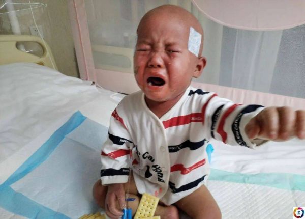 北京某医院内血液科病床上,鞠凤一岁多的儿子程韬安在移植后皮肤排异浑身伤痕累累,伤口扯得孩子疼得眼泪汪汪,他咿咿呀呀地哭喊着,嘴角结痂的伤疤又破裂。鞠凤在一旁听着儿子喑哑的哭声,看着面目模糊的孩子,心痛得无法呼吸。医生让她买两万块的去纤甘药物压制孩子的肝肾功能损伤,可她兜里早已掏不出一分钱,每个晚上她都在直播间哭着求助,绝望的母亲不停地呐喊着:“求求大家救救我的孩子吧。”图为病床上哭泣的稻安。