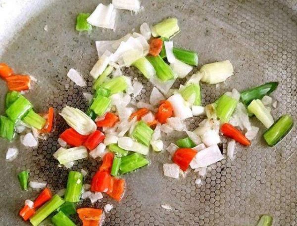 第三步:在平底锅中加热油。当油发出嘶嘶声时,加入干辣椒、肉汁奶酪薯条和蒜末,炒香。