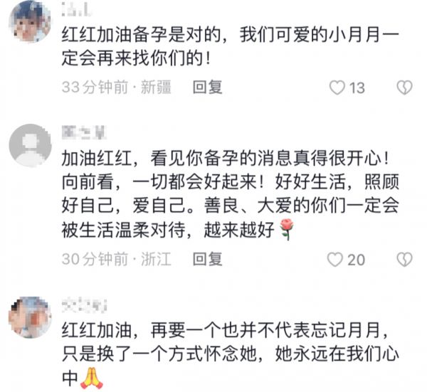 对于,红红和涛子备孕二胎,不少网友评论也还很暖心,表示支持两人的决定,时间是最好的良药,可以抚平伤口,虽然,失去亲人的痛苦可能需要很长时间来疗愈,但是,我们相信,红红和涛子能够很快从阴霾中走出来。