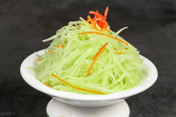 1.取一根新鲜的莴笋,去掉皮切成细丝放入盆中备用,准备的红辣椒也切成细丝,大蒜去皮切末。