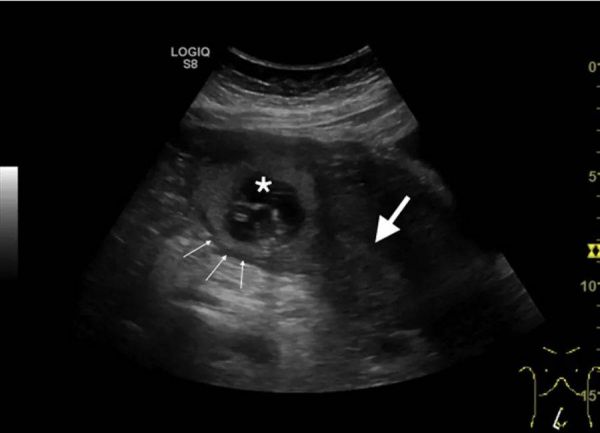 图:经腹超声显示胎囊位于子宫底右侧(星号),远离子宫内膜腔(白色大箭头)。图中还显示菲薄肌层(细白色箭头)。