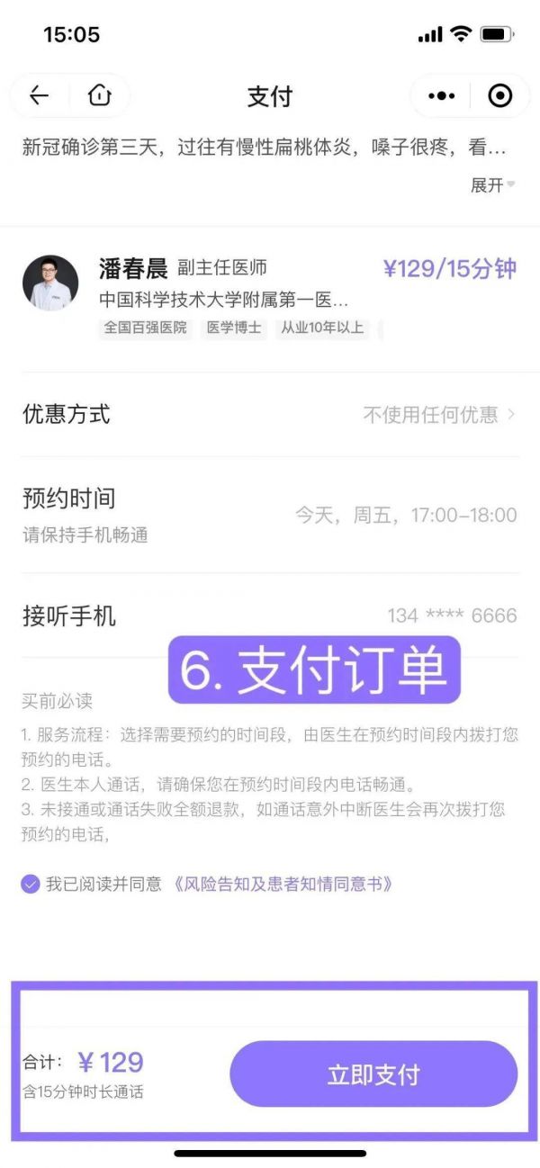 然后在预约的时间保证电话通畅,准备和医生沟通就可以了。电话咨询一共有 15 分钟,医生能够更好地了解病情,您也可以获取更详细的治疗方案和护理建议。