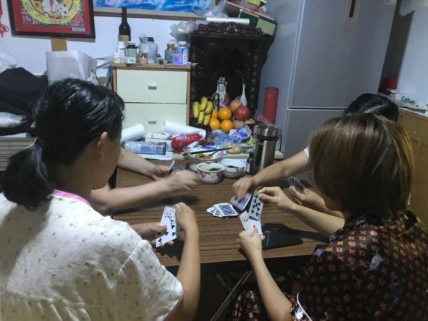 穿着睡衣的姐妹们一起打牌消磨时间。